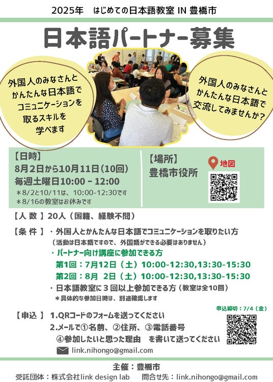 令和7年度から新しく日本語パートナーとして参加する方に向けて、教室の方向性や外国人との接し方などについて学ぶことができる講座を7月12 日(土)及び8月2日(土)に開催します。