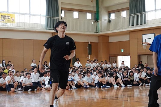 体育の授業ではフリースロー対決を行い、ハーフラインからシュートを決める長野選手に大盛り上がりでした。