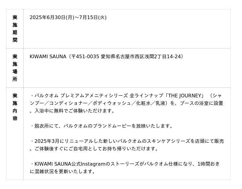 『ととのうのその先「きわまる」へ。』を合言葉に、感動のサウナ体験を追求する「KIWAMI SAUNA」と、厳選した成分と処方で高い効果実感を追求したプロダクトを展開するメンズスキンケアブランド「バルクオム」が、初のコラボレーションイベントを実施いたします。今回のコラボレーションイベントでは、「心地よい香りと、リッチな使用感で肌もきわまる、整いきわまる。」というコンセプトのもと、バルクオムが展開するプレミアムアメニティライン『THE JOURNEY』を施設内に設置。さらに、施設内モニターでの映像演出や、KIWAMI SAUNA公式Instagramの混雑状況投稿(1時間ごとに更新)もバルクオム仕様に変更いたします。お客様のサウナ体験をより上質にアップデートします。