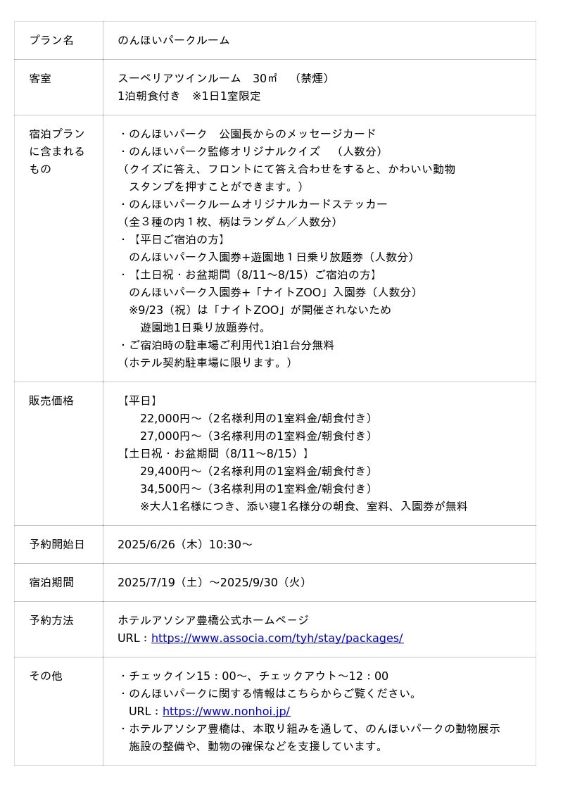 株式会社ジェイアール東海ホテルズ ホテルアソシア豊橋(所在地:愛知県豊橋市 総支配人:久保 儀一)は、2025年7月19日(土)~2025年9月30日(火)の期間、「のんほいパークルーム」を販売いたします。