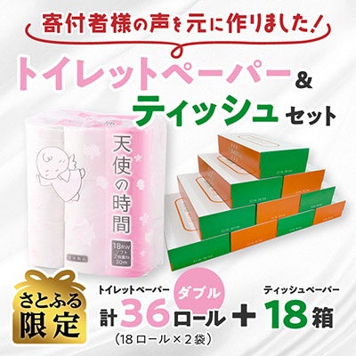 【さとふる限定】トイレットペーパー 天使の時間 ダブル 18R×2袋(36ロール)+ティッシュ18箱