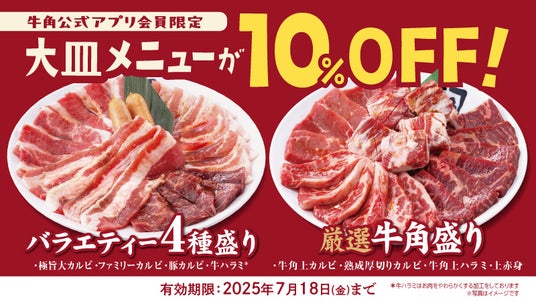 コロワイドグループの株式会社レインズインターナショナルが展開する牛角では、2025年6月30日(月)から7月18日(金)まで、牛角公式アプリ会員様限定で「選べる3種のクーポン」をご用意いたします。