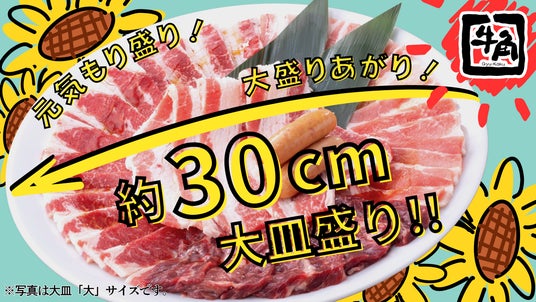 テーブルを華やかに盛り上げる「大皿」は、ご家族で気軽に楽しめる「バラエティー4種盛り」と、牛角の看板メニューを堪能できる「厳選牛角盛り」の2種類をご用意。大サイズはお皿の直径が約30cmのビッグサイズ!サイズはそれぞれ「並 2~3人前」と「大 3~4人前」があるため、シーンに応じてご利用いただけます。この機会にぜひ、牛角で人気の「大皿メニュー」をお得にお楽しみください。