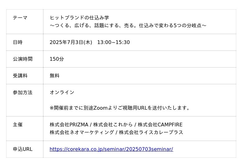 本セミナーでは、【つくる】【広げる】【話題にする】【売る】というステップに分けて、ブランド開発から売上創出までの“勝負を分ける分岐点”を徹底解説!