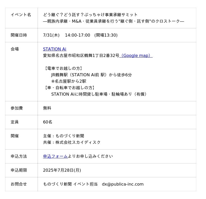 株式会社スカイディスク(本社:福岡県福岡市中央区、代表取締役CEO:内村 安里、以下「スカイディスク」)は、ものづくり新聞主催、スカイディスク共催の「どう継ぐ?どう託す?ぶっちゃけ事業承継サミット ―親族内承継・M&A・従業員承継を行う"継ぐ側・託す側"のクロストーク―」を開催します。