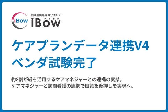 在宅医療のDX支援を行う株式会社eWeLL(証券コード:5038 本社:大阪市中央区)は、訪問看護専用電子カルテ「iBow(アイボウ)」が「ケアプランデータ連携システム(V4)」のベンダ試験が完了したことをお知らせいたします。