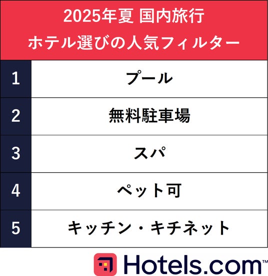 今年の夏の国内旅行のホテルを検索しているユーザーが最も多く使用したフィルター*4を見てみると、1位には夏休みの旅行には欠かせない「プール」。また、2位には「無料駐車場」、5位には「キッチン・キチネット」がランクインしており、昨今の物価高を考慮して、移動や食事の費用を抑えようと考えている人が多いことが伺えます。