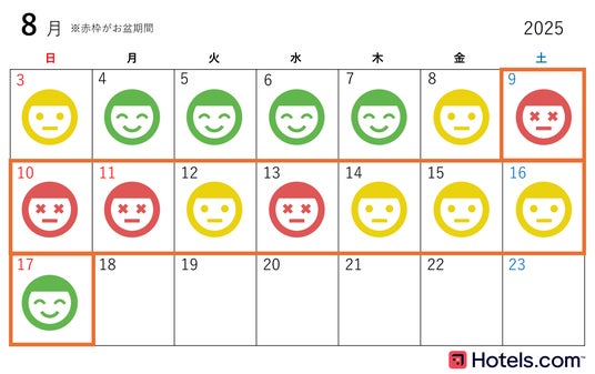 最大9連休となる今年のお盆。お盆前の2025年8月3日(日)から8月17日(日)のお盆期間のうち、Hotels.comのホテル宿泊検索データ によると、8月9日(土)から8月11日(月・祝)、そして8月13日(水)が特に混雑すると予想されます。期間中、最も混雑が少ないと考えられる8月17日(日)に比べて、最も混雑が予想される8月9日(土)は3倍以上混雑する可能性があります。お盆の連休に合わせて、有給休暇を取得できる場合は、8月4日(月)から8月7日(木)の間の旅行、もしくは8月17日(日)以降の、混雑を避けた旅行をおすすめします。