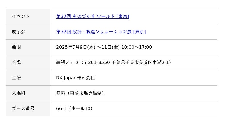 株式会社テクノア(本社:岐阜県岐阜市、代表取締役:山崎 耕治)は、7/9~11に幕張メッセで開催される「第37回 ものづくり ワールド [東京]」に出展いたします。