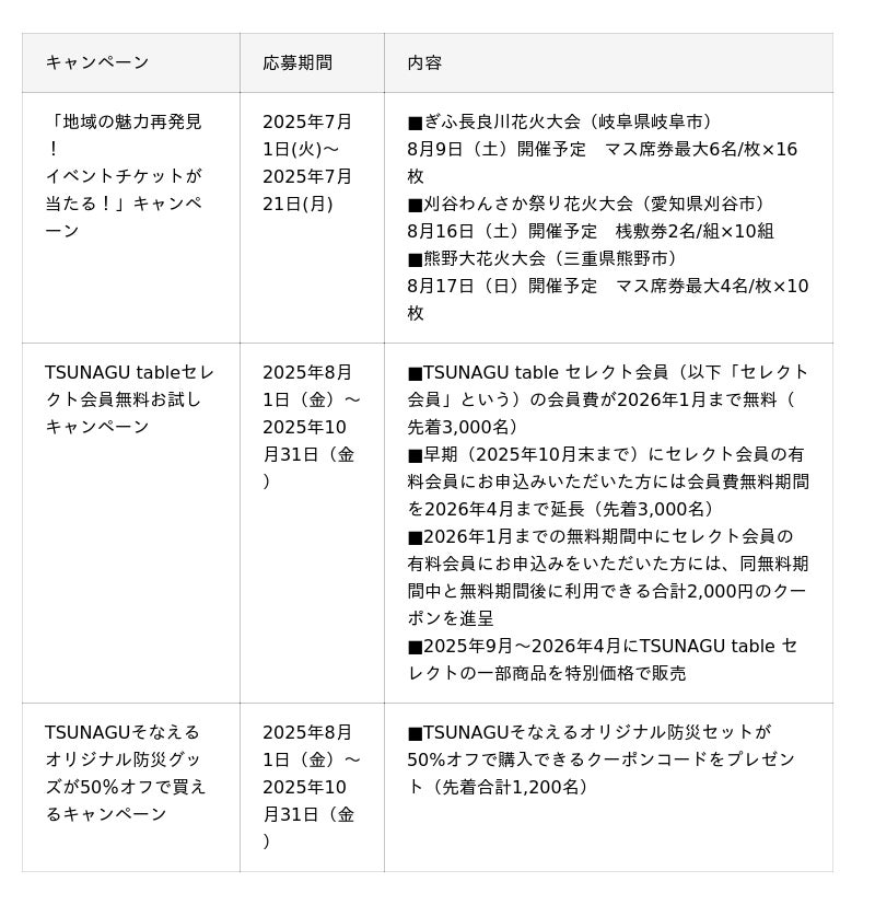 そのほか、フードロス削減に貢献しながら家族の食卓を豊かにする「TSUNAGU」シリーズ※5の「TSUNAGU tableセレクト」会員費無料お試しキャンペーンや、「TSUNAGUそなえる」オリジナル防災グッズが50%オフで購入できるキャンペーンなど、お客さまの暮らしに役立つ企画を順次開始いたします。