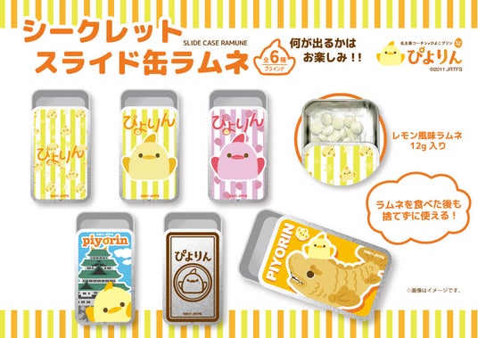 人々がふと足を止める「シズル感あるモノづくり」を展開する株式会社レイニーブルー(本社:愛知県小牧市・代表取締役:鈴村直也)は、ジェイアール東海フードサービス株式会社(本社:愛知県名古屋市、代表取締役社長:岩下賢一)のオリジナルスイーツ「ぴよりん」とコラボレーションした新商品「ぴよりん シークレットスライド缶ラムネ(全6種)」を発売いたします。