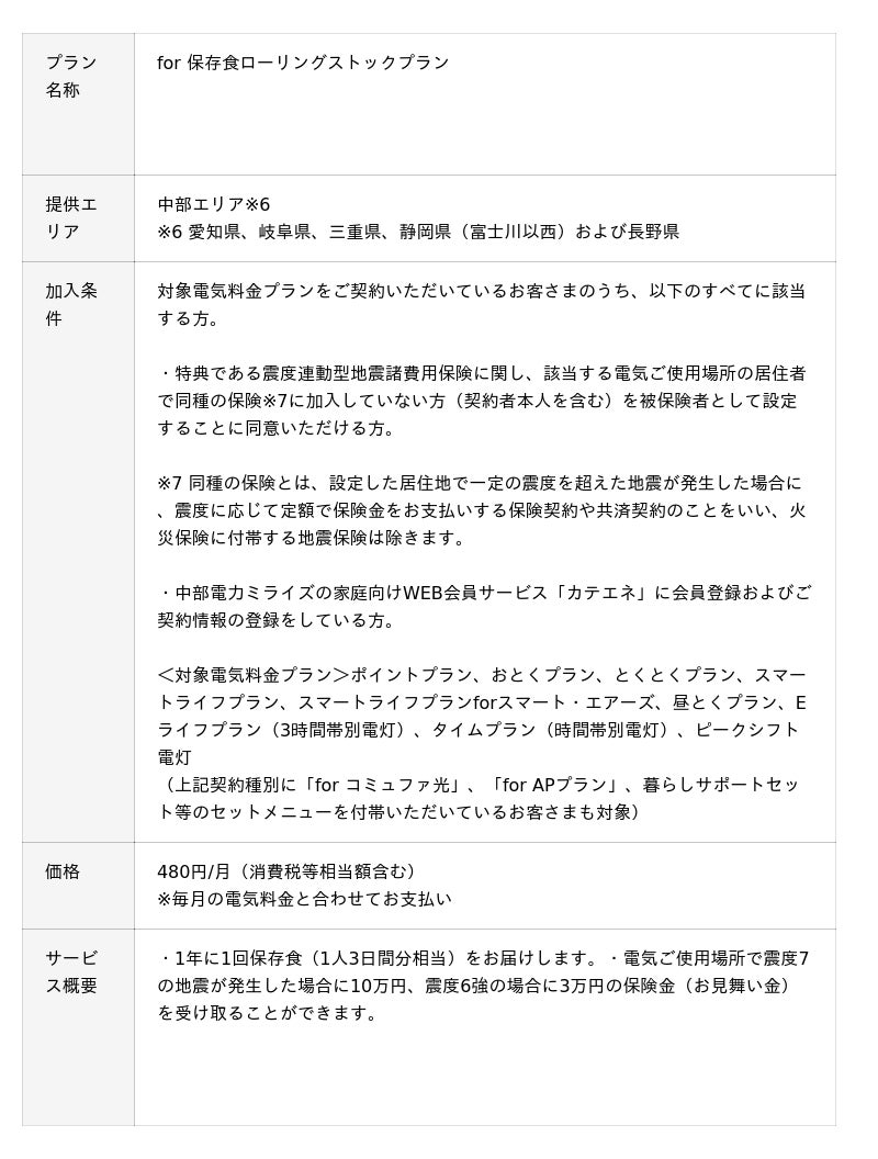 中部電力ミライズ株式会社(本店:愛知県名古屋市、代表取締役:神谷 泰範、以下「中部電力ミライズ」)と中部電力ミライズコネクト株式会社(本社:愛知県名古屋市、代表取締役社長:秋山 光輝、以下「中部電力ミライズコネクト」)、あいおいニッセイ同和損害保険株式会社(本社:東京都渋谷区、代表取締役社長:新納 啓介、以下「あいおいニッセイ同和損保」)は、防災対策の支援を目的として、本日から、ご家庭のお客さま向けに電気料金メニューとあわせてご契約いただけるセットメニュー「for 保存食ローリングストックプラン」(以下「本プラン」)の提供を開始しますので、お知らせします。