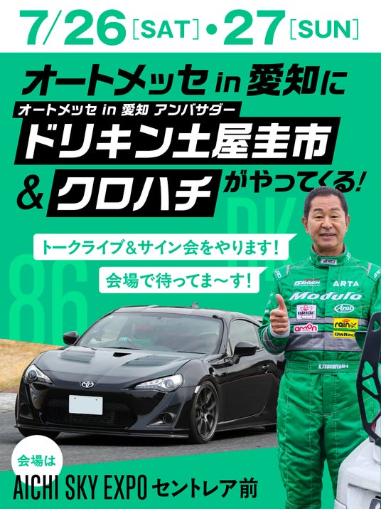 オートメッセアソシエイションは、2025年7月26日(土)から27日(日)の2日間、愛知県常滑市のAICHI SKY EXPOにおきまして、「第1回 オートメッセ in 愛知 2025」を開催いたします。レーシングドライバーの土屋圭市氏によるサイン会およびトークショーに加え、SUPER GTマシンの展示や親子で楽しめる「こどもビリティ」エリアなど、老若男女を問わずワクワクできるコンテンツを用意。また、前売りチケットの発売を7月1日(火)より実施いたします。