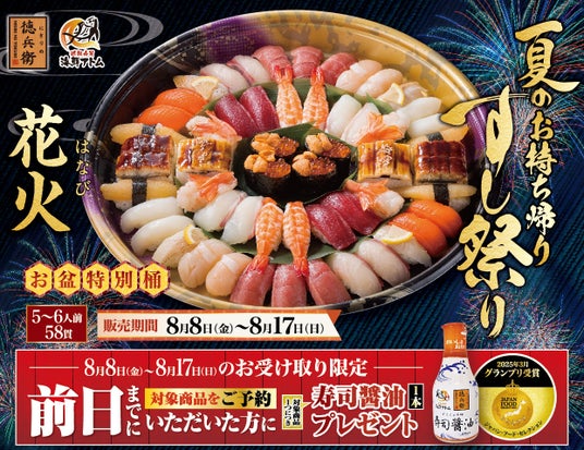 お盆特別桶「花火」が今年も登場!前日までに前日までに対象のお持ち帰り商品をご予約いただくと『寿司醤油』をプレゼント!