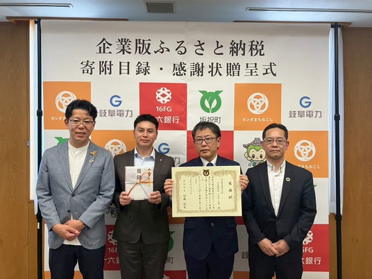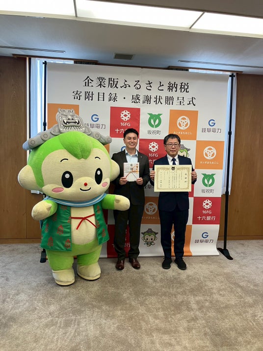 2024年12月18日に公表した「岐阜電力株式会社(本社:岐阜県岐阜市、代表取締役 下田平(しもだいら) 真樹(まさき)、以下、岐阜電力という)を寄附者とする、一般的な寄附や企業版ふるさと納税制度を活用した地方自治体の脱炭素まちづくりの公募」の結果、岐阜電力株式会社は、第二弾として選定した坂祝町へ企業版ふるさと納税1,000万円を行い、寄附目録・感謝状贈呈式を行いました。
