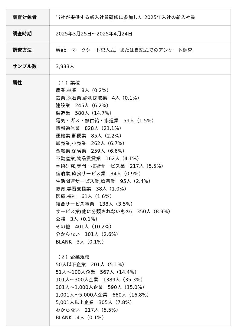 累計20,000社450万人以上の組織開発・人材育成を支援するALL DIFFERENT(オールディファレント)株式会社(所在地:東京都千代田区 代表取締役社長:眞崎大輔)および「人と組織の未来創り(R)」に関する調査・研究を行うラーニングイノベーション総合研究所(R)は3月25日~4月24日の期間で、2025年度入社の新入社員3,933人を対象に「新入社員意識調査」を行いました。本リリースでは、製造業の新入社員の調査結果を公表いたします。