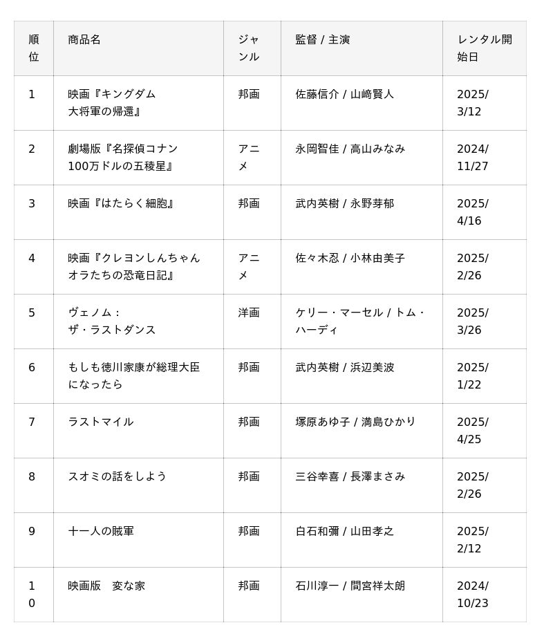株式会社ゲオホールディングス(本社:愛知県名古屋市中区、代表取締役社長執行役員:遠藤結蔵)のグループ会社、株式会社ゲオストア(本社:愛知県名古屋市中区、代表取締役社長:濱野敏郎)は、2025年1月1日から2025年6月15日まで、全国のゲオショップで取り扱ったBD・DVDの貸出数量を集計し、「【2025上半期】ゲオ レンタル映像貸出数量ランキング」として発表します。なお、対象となる店舗数は約900店舗です。