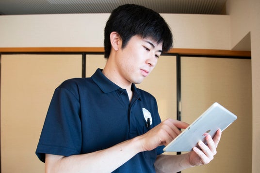 既存のパッケージソフトでは不便な部分もあったため、自 社業務に合うように一から開発。現場では持ち運びが便利なタブレットを持参して使用。