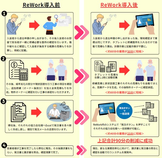 賃貸物件の管理業務では、入居者から退去の申請があった場合、退去立会い・原状回復(修繕)・費用 精算に至るまで、さまざまな作業が行われます。従来、各工程では紙の書類やExcelファイル、電子メールなどを用いた手作業が多く、属人的かつ煩雑な業務負担が発生していました。「ReWork」はこの一 連の業務プロセスを一つのプラットフォーム上で一元管理し、データ入力から書類作成・送信までを自 動処理することで効率化を図る業務支援システムです。試行運用を通じて改良を重ね、2024年4月まで機能アップデートを図り最適化を行いました。