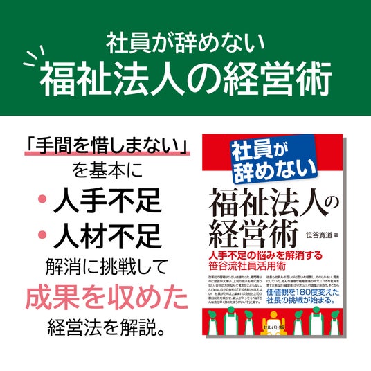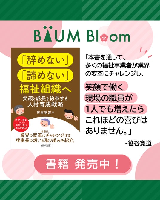 笹谷の著書 「社員が辞めない福祉法人の経営術」発売中本書は、現役経営者である笹谷がバウムカウンセリングルームで実践してきた、“手間を惜しまない”姿勢を軸にした経営スタイルをもとに、人手不足・人材不足の課題に正面から向き合い、実際に成果を上げてきた取り組みを解説した一冊です。