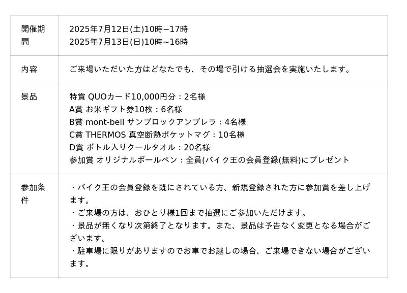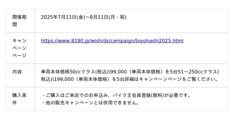 7月11日(金)~8月11日(月・祝)までの期間限定で、50ccクラスは車両本体価格99,000円(税込)、51~250ccクラスは車両本体価格199,000円(税込)の目玉車両をそれぞれ5台ずつ販売いたします。