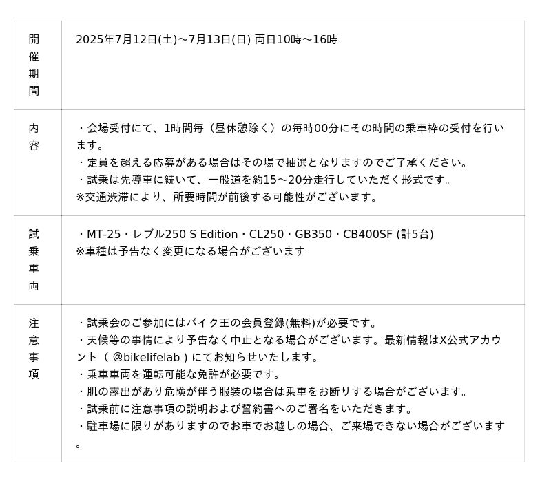 また、今回豊橋店リニューアルイベントに際して、全国のバイク王店舗でレンタルバイクとして稼働中のCB400 SUPER FOURなどロングセラーの車両からホンダ GB350、ヤマハMT-25など今人気の車両に無料で乗れる、試乗会を実施いたします。ぜひこの機会にお試しください。