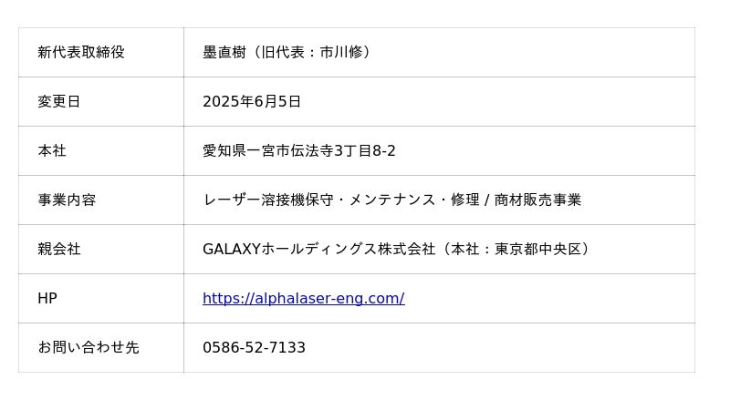 ドイツ・ALPHA LASER社製レーザー溶接機の国内市場に向けた販売およびサービス事業を正規販売代理店として展開するALPHA LASER ENGINEERING株式会社(本社:愛知県一宮市、以下、ALPHA LASER ENGINEERING)は、2025年6月5日をもって、代表取締役を交代いたしました。