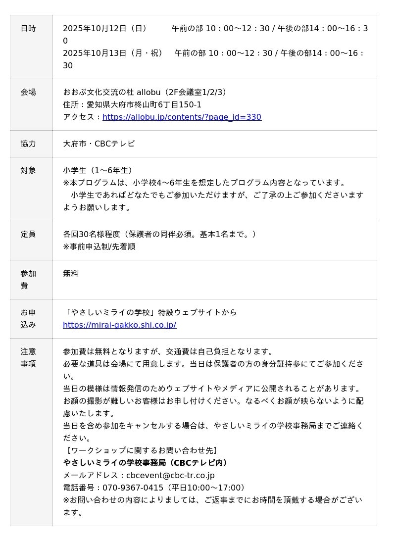 住友重機械工業株式会社(本社:東京都品川区、代表取締役社長:下村真司、以下「当社」)は、2025年10月12日(日)、13日(月・祝)に愛知県大府市で、小学生を対象としたSTEAM教育(※1)ワークショップ「やさしいミライの学校」を開催します。