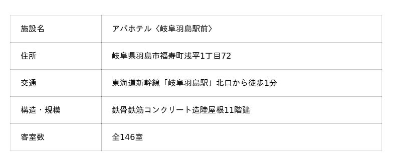 本ホテルは東海道新幹線「岐阜羽島」駅、名鉄羽島線「新羽島」駅それぞれ徒歩1分の駅前立地で、「名古屋」駅まで新幹線で1駅10分とビジネスや観光の拠点としてアクセス性に優れている。近年では岐阜の玄関口としてのポテンシャルにより、インバウンド需要も活況になりつつあるこのエリアで今後ビジネス、レジャー需要の更なる集客を狙う。