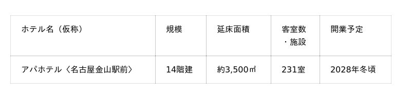 同時にアパグループは愛知県名古屋市「金山駅」前にホテル開発計画を発表した。本案件地は、JR・私鉄・地下鉄5路線が利用できる「金山駅」より徒歩2分。中部国際空港にもダイレクトアクセス可能な交通の拠点に位置することから今回の計画に至った。開発計画は下記の通り。