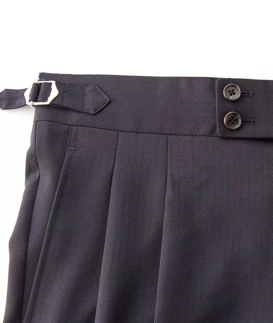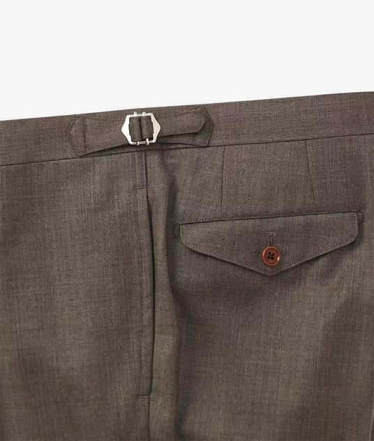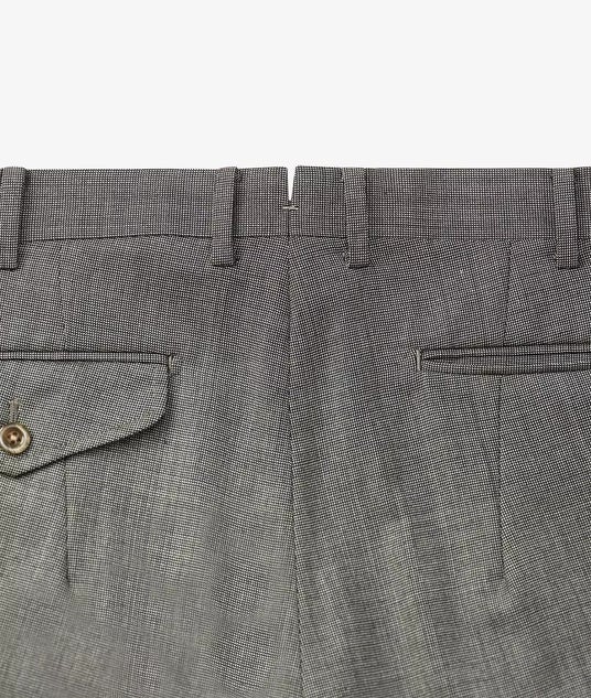 ハイウエスト1930年代英国スーツのクラシックなテイストを現代に蘇らせたスタイル。太いマーベルトがウエストのアクセントとなり、現代のパンツシルエットにもマッチします。この仕様の場合、脇尾錠、Vスリットが標準で付きます。