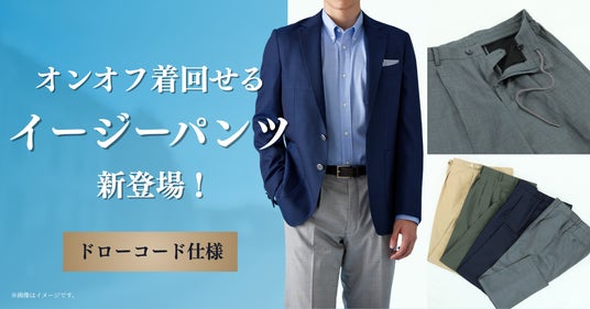 オーダースーツ専門店「グローバルスタイル」を運営するグローバルスタイル株式会社(東京証券取引所 スタンダード市場:7126、本社:大阪市中央区、代表取締役社長 田城弘志)のパンツのデザインに、新たにドローコード仕様のイージーパンツ(イージースラックス)が登場しました。フロントの紐とウエスト脇のゴムで、簡単にウエストを調整することができます。軽やかな着心地ときれいめシルエットで、毎日のスタイルアップに最適です。
