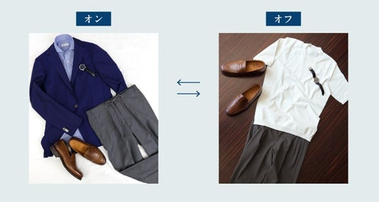 イージーパンツ(イージースラックス)はワイシャツだけでなく、Tシャツやニットともコーディネートがしやすいので、オンオフ問わず着用いただけます。