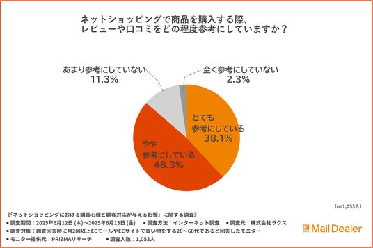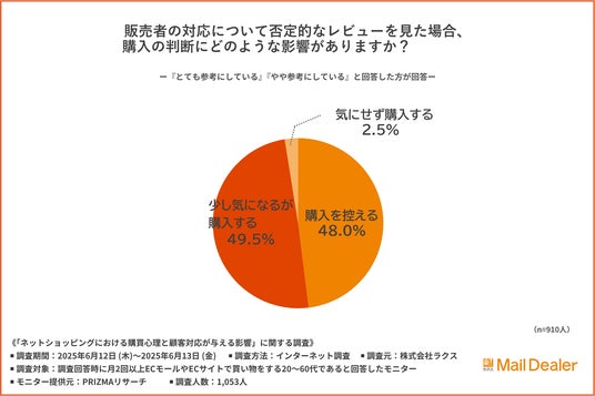 ネットショッピングで購入する際、約9割がレビューや口コミを参考にしていることがわかりました。中でも、販売者の対応に対する否定的なレビューがある場合、約半数が「購入を控える」と回答しており、レビューや口コミが購買行動に与える影響の大きさがうかがえます。