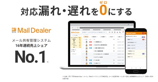 「メールディーラー」は、チーム全員のメールの対応状況を見える化し、返信漏れや二重返信を防止する問い合わせ管理システムです。