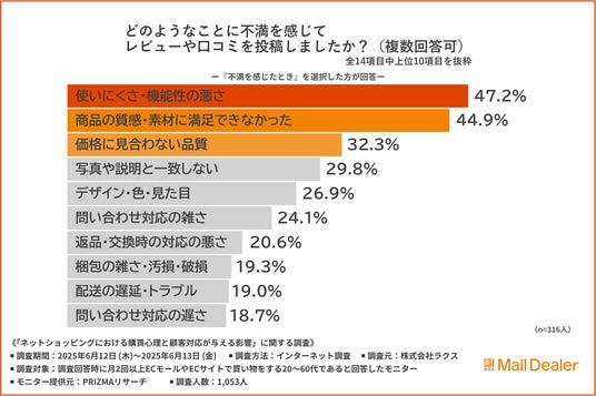 先ほどの質問で「不満を感じたときにレビューや口コミを投稿した」と回答した方に、その不満の理由を尋ねたところ、『使いにくさ・機能性の悪さ(47.2%)』『商品の質感・素材に満足できなかった(44.9%)』『価格に見合わない品質(32.3%)』などが上位になりました。