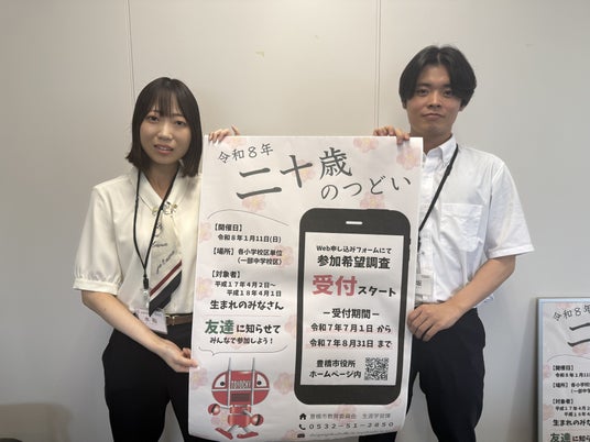 愛知県豊橋市は、2026(令和8)年1月11日(日)に開催される「二十歳(はたち)の集い」の参加希望調査を実施しています。7月1日(火)から始め、8月31日(日)まで行っていますので、ぜひ登録をお願いします。
