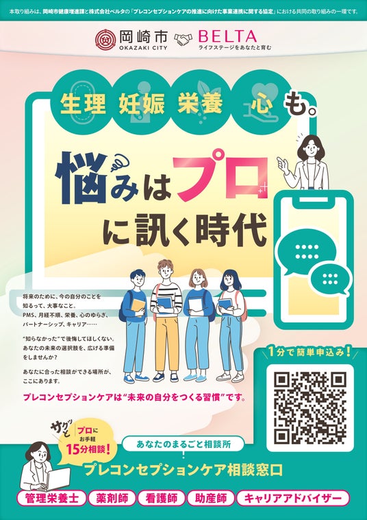 岡崎市との連携により、市内大学生向けのプレコンセプションケア相談窓口を設置しました。「相談できない」「一人で悩んでいる」といった声に応え、正しい知識へつながる環境を整えることを目的としています。今後も岡崎市と連携し、新たな支援の形を広げてまいります。