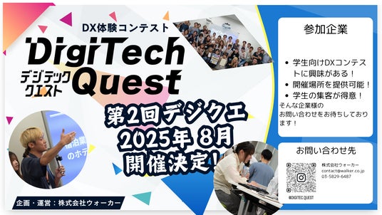 2025年、学生が企業のリアルな課題に挑む実践型DXコンテスト「Digitech Quest(デジテック・クエスト)」が、好評につき第2回開催となりました。本コンテストは、第1回に引き続き、主催:岐阜大学、運営:株式会社Walker という体制で実施。さらに今回は、NTTドコモ様をリードスポンサーにお迎えし、より一層のスケールでの開催が決定いたしました。