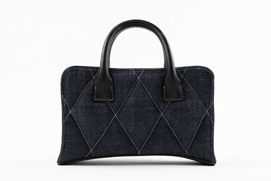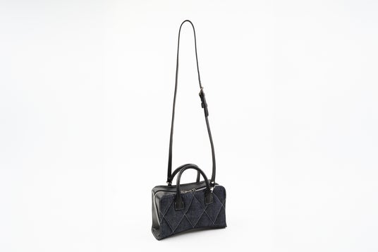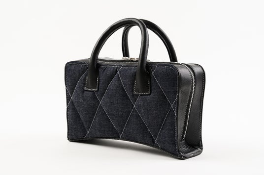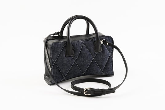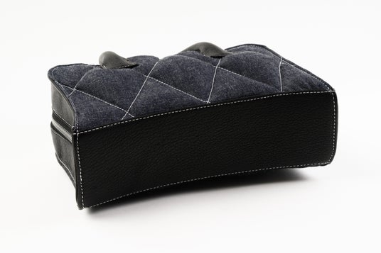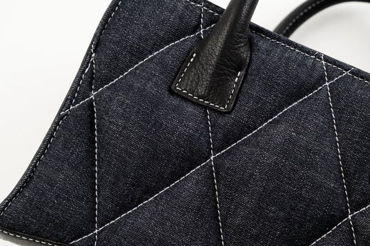 表裏はダイヤモンドキルトのふっくら仕上げ、裏地共にセルビッチデニム、底のアーチ形状が特徴的です。