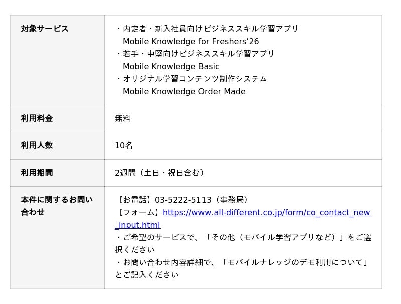 累計20,000社450万人以上の組織開発・人材育成を支援するALL DIFFERENT(オールディファレント)株式会社(所在地:東京都千代田区 代表取締役社長:眞崎大輔)は、2026年度入社予定の内定者・新入社員向けビジネススキル学習アプリ“Mobile Knowledge”のデモ利用サービスを、企業や法人の人事・教育担当者を対象に、無料で提供開始したことをお知らせいたします。