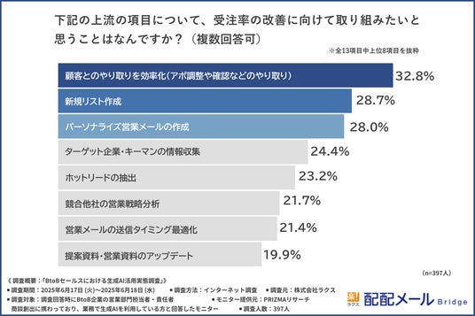 そこで、「上流の中で取り組みたい内容」について尋ねたところ『顧客とのやり取りの効率化(32.8%)』が最も多く『新規リスト作成(28.7%)』『パーソナライズ営業メールの作成(28.0%)』と続きました。