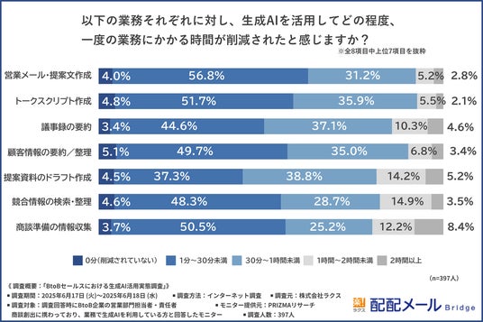 各業務で最も多かったのは「1分~30分未満」の時間削減であり、特に『営業メール・提案文作成(56.8%)』や『商談準備の情報収集(50.5%)』など文章を扱う定型作業で時間削減の傾向が際立ちました。
