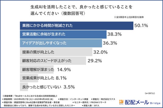 次に、「生成AIを活用して良かったと感じていること」について尋ねたところ『業務にかかる時間が削減された(50.1%)』と回答した方が最も多く、『営業活動に余裕が生まれた(38.3%)』『アイデアが出しやすくなった(36.3%)』と続きました。