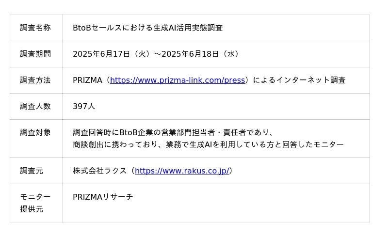 そこで今回、株式会社ラクスが提供する商談獲得特化型ツール「配配メールBridge」(https://www.hai2mail.jp/bridge/)は、BtoB企業の営業部門担当者・責任者を対象に「BtoBセールスにおける生成AI活用実態調査」を行いました。