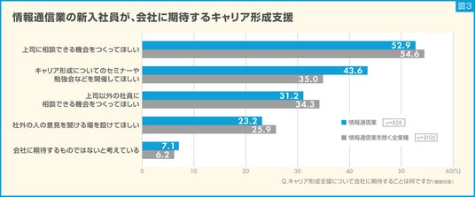 専門家志向の割合が高い情報通信業の新入社員ですが、キャリア形成について会社に期待する支援は何か質問しました。