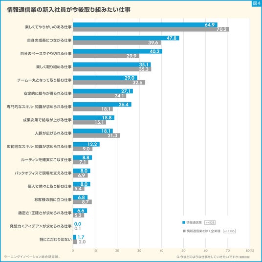 4.今後取り組みたい仕事「自身の成長につながる仕事」「自分のペースでやり切れる仕事」が他業種より8.2ポイント、10.3ポイント高い