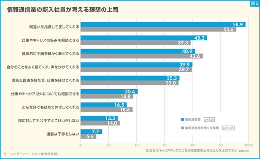 結果、「間違いを指摘して正してくれる」が58.9%で1位となりました。次いで、「仕事やキャリアの悩みを相談できる」が45.2%、「具体的に手順を細かく教えてくれる」が40.9%という結果となりました。「仕事やキャリアの悩みを相談できる」については、他業種より5.9ポイント高い結果となりました(図8)。