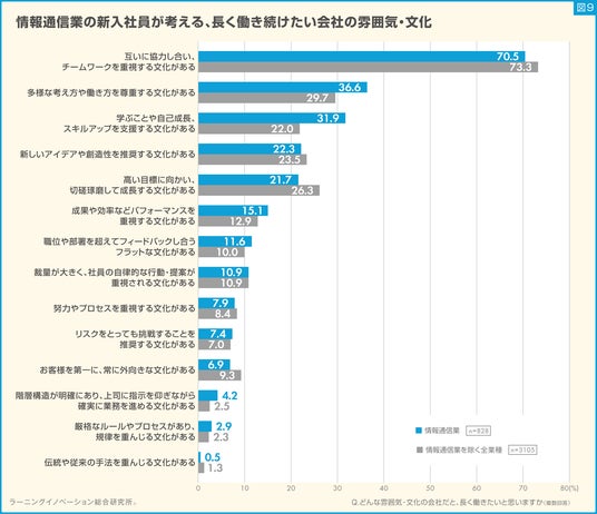 他業種とより割合が高くなった項目は、「学ぶことや自己成長、スキルアップを支援する文化がある」、「多様な考え方や働き方を尊重する文化がある」となり、それぞれ9.9ポイント、6.9ポイント高い結果となりました(図9)。