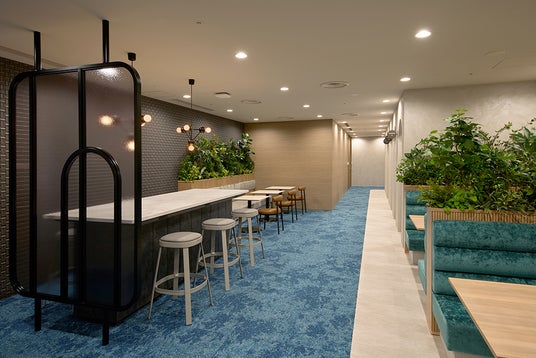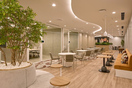 ・暖かな照明のなか、緑に癒されながら、ゆっくり疲れを取れるカフェスペース